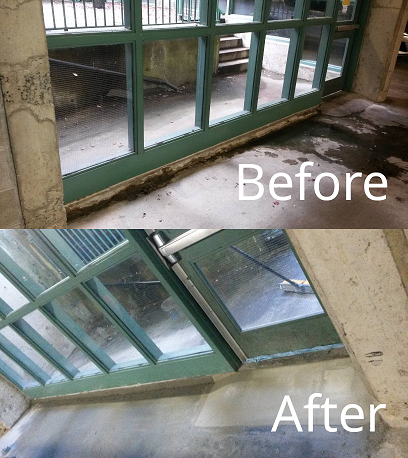 This customer had an issue with ground water entering the building at the floor joint below the window and door. The leak also caused the concrete ramp in front of the door to separate from the floor and become loose. Huinink Ventures personnel, injected and sealed the floor joint with polyurethane injection resin and crystalline cement and also replaced the existing loose walking ramp with a new one that was resessed into and anchored to the concrete floor slab for extra strength.