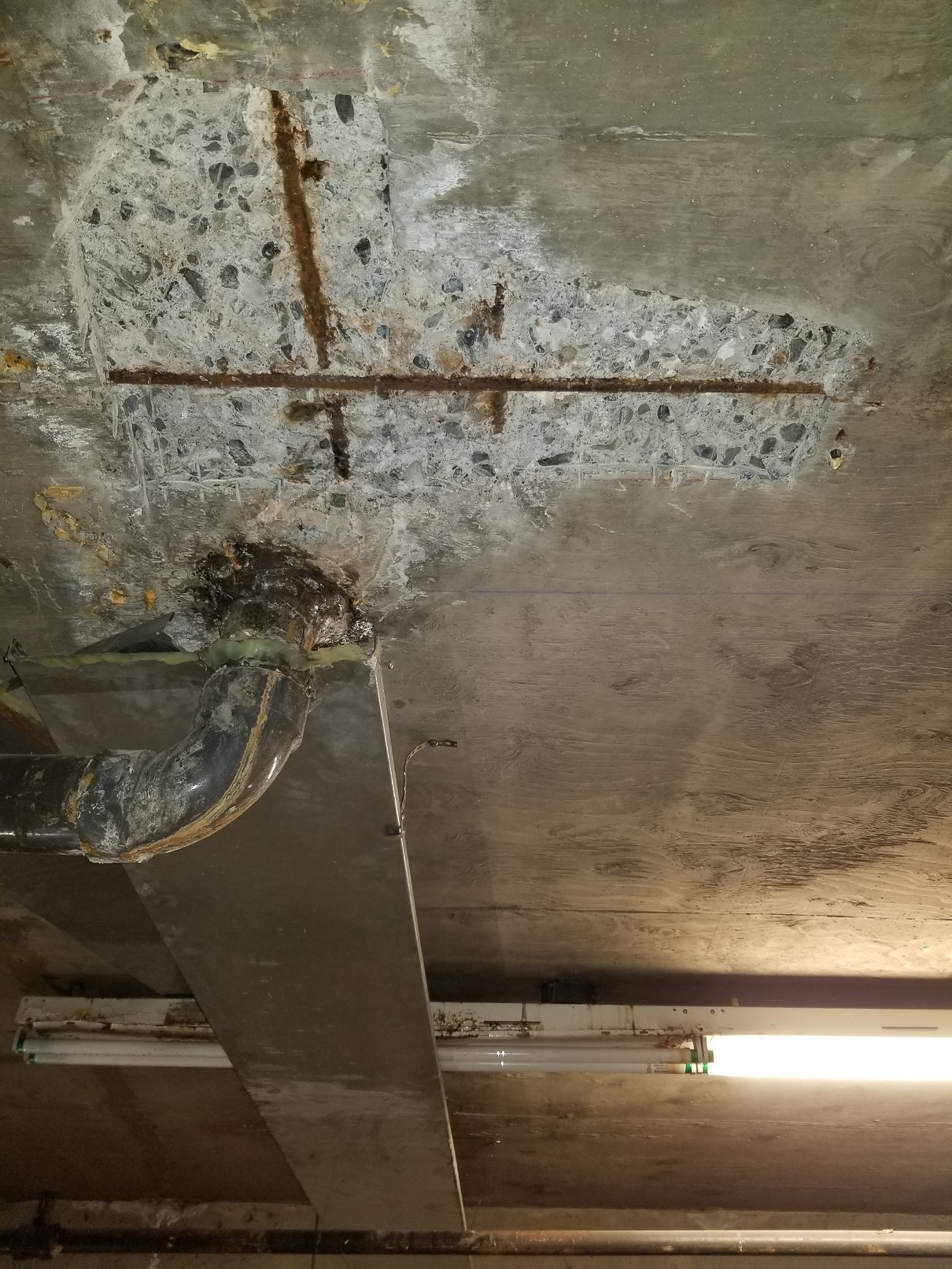 Several areas in this parking garage were exeriencing concrete flaking and spalling that was beginning to fall on vehicles, these areas were cut out and repaired by Huinink Ventures Ltd.